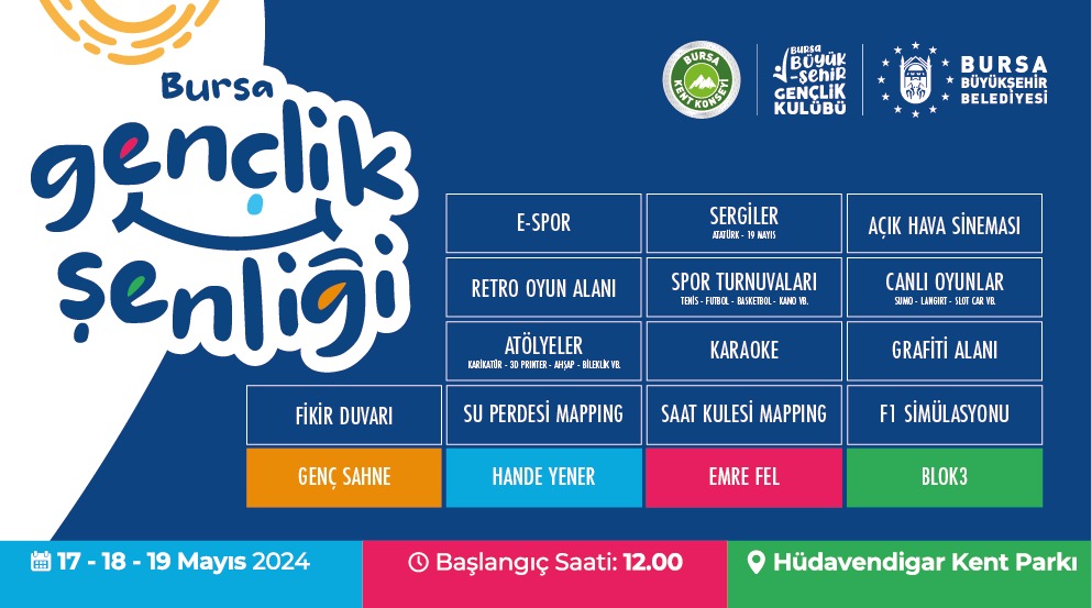 Bursa Büyükşehir Belediyesi tarafından hazırlanan birbirinden farklı etkinliklerle, 19 Mayıs Atatürk’ü Anma, Gençlik ve Spor Bayramı bu yıl da coşkuyla kutlanacak. Spor müsabakalarından atölyelere kadar üç gün boyunca sürecek olan kutlamalarda, Hande Yener, Emre Fel ve Blok3 gibi ünlü isimler Bursalılar için sahne alacak.