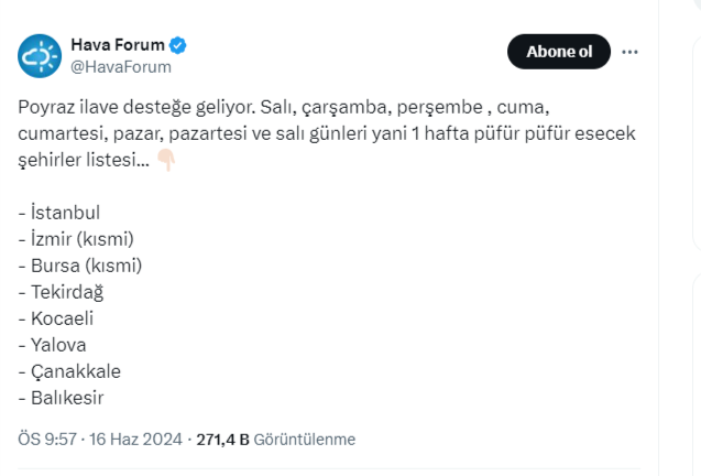 Hava Forum isimli meteoroloji kaynağı tarafından X hesabından yapılan açıklamada, Poyraz rüzgarlarının etkisinin artacağı ve bu sayede sıcaklıkların önemli ölçüde düşeceği belirtildi.